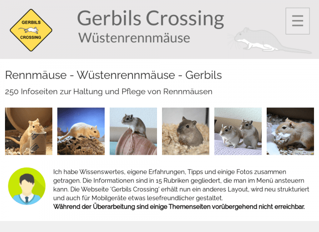 Wer sich über Wüstenrennmäuse informieren möchte, findet auf Gerbils-Crossing sicher die ein oder andere Anregung. Weil die Überarbeitung der Website und die Übertragung der Seiten in das neue Format noch nicht abgeschlossen ist, habe ich zum Stöbern ein Schlagwortverzeichnis erstellt. Das Register mit Suchworten von A bis Z hilft möglicherweise, Inhalte leichter zu finden und verschafft einen raschen Überblick der bereits zur Verfügung stehenden Informationen. Stichwort-Verzeichnis A - Z
